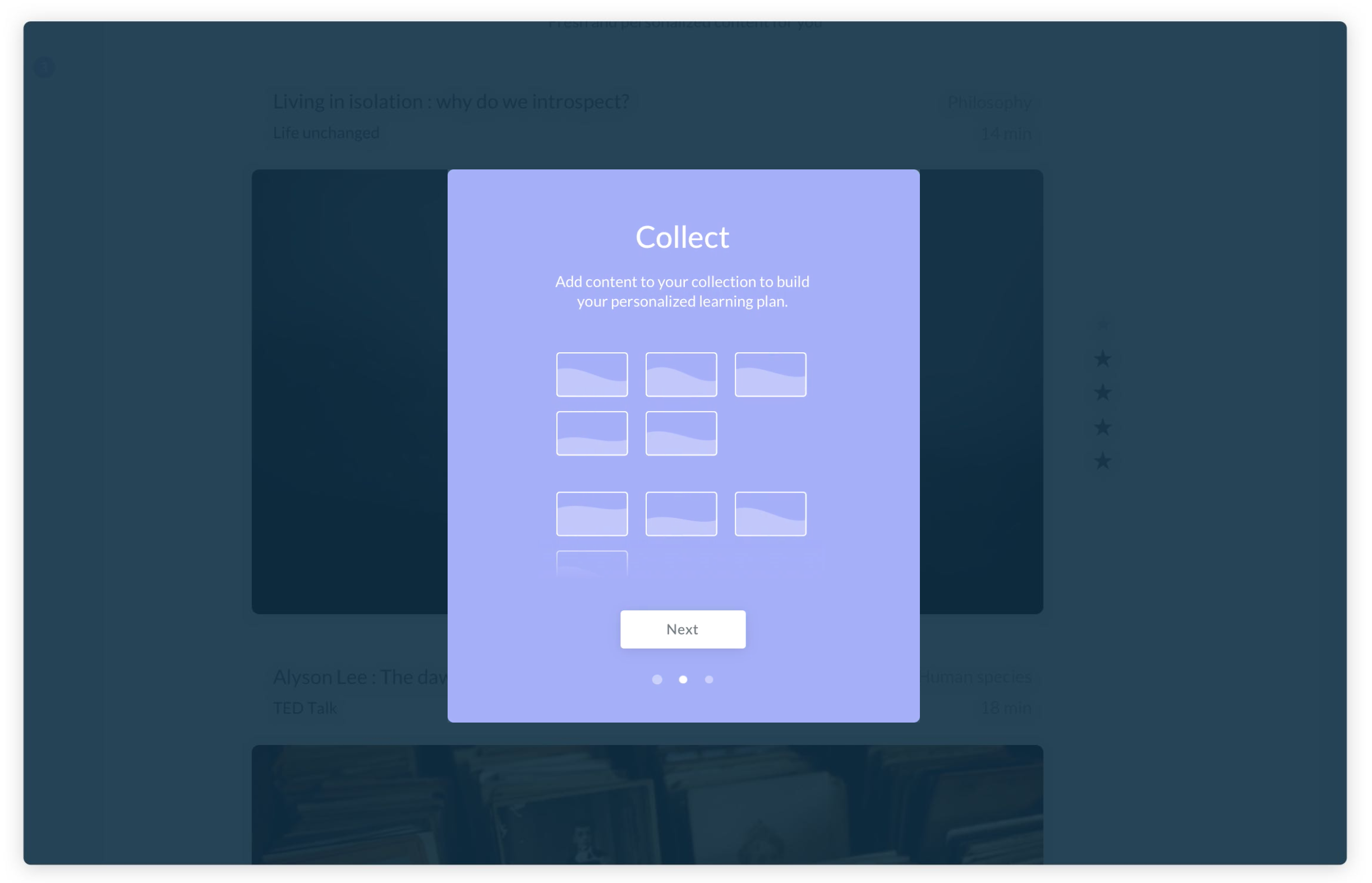 When a product is referred by a friend or colleague, users often skip the landing page instructions and sign up to the platform right away. To make sure that the in-app experience is fluid and new users understand the key features of the platform, a few in-app introduction screens were created. Note that this is a concept and the illustrations would be replaced by more concrete and useful representations.